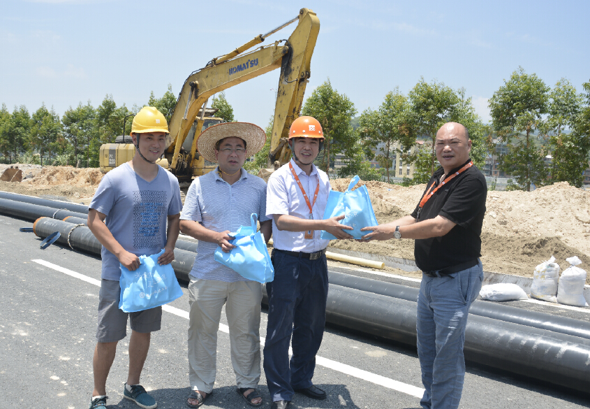 随后一行人员前往公司重点工程项目——连江通港大道次高压管道铺设工程及罗源湾滨海新城6区施工现场,郑主席为现场施工人员发放了高温防暑慰问品,并仔细询问了工程建设过程中安全生产、防暑降温和劳动保护措施。他要求工程项目部负责人要采取灵活的工作方式,尽量避开高温作业,注意施工安全,做好防暑降温和安全宣讲工作。