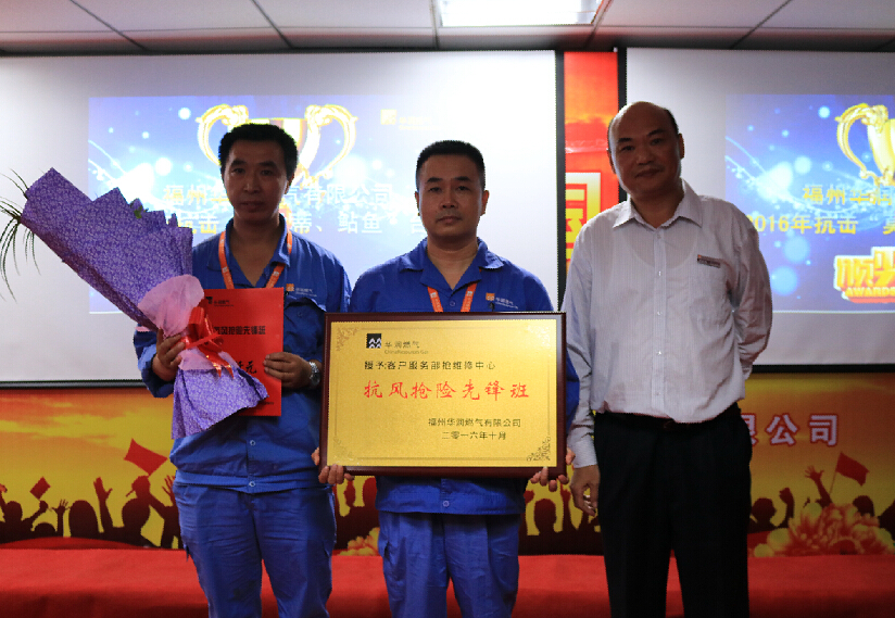 管网运行部检修车间二班、车用燃气事业部设备科、客户服务部抢维修中心、运行管理部生产设备室、福州市煤气工程安装有限公司项目部5个救灾复产先进团队被授予“抗风抢险先锋班”荣誉称号;运行管理部尤成杰、管网运行部许用、车用燃气事业部王伯峰、安装公司林继超、客服部王兆和、连江公司赵喜文等6个单位共19名在抢修保障做出突出贡献的员工被授予“抗风抢险先进个人”荣誉称号;办公室杨锋荣获宣传通讯及时奖,其他所有参战员工获得积极参与奋勇拼搏奖。