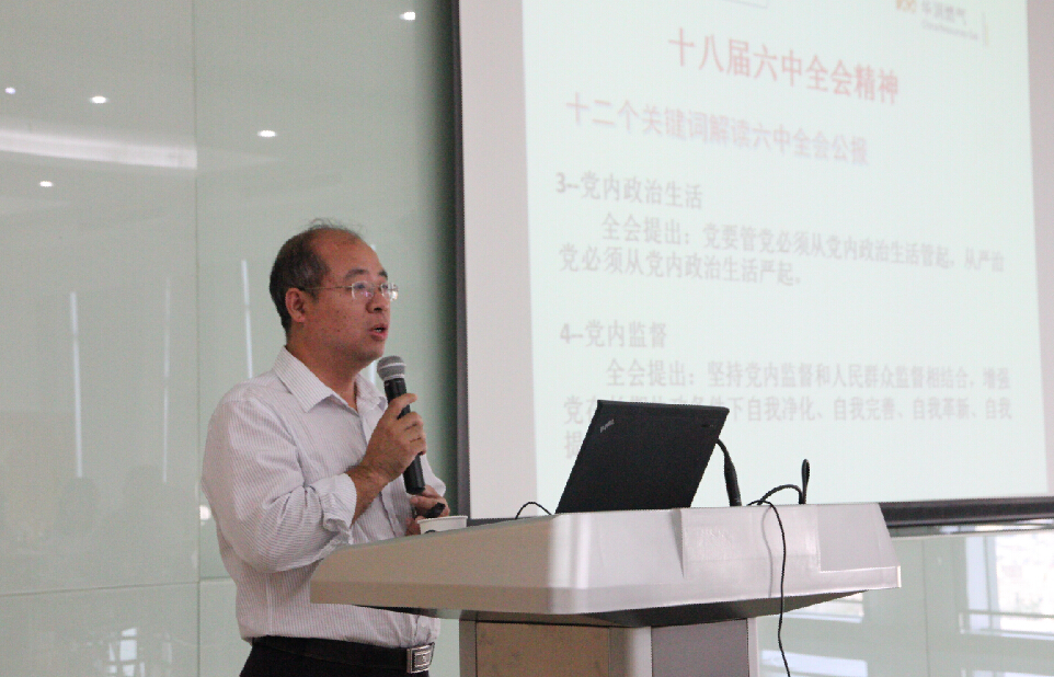 会议邀请福州公司党委委员、党群工作部主任谢长健传达学习贯彻十八届六中全会精神,他从“全面从严治党”、“领导核心”、“党内政治生活”、“党内监督”等十二个关键词详细讲解了党的十八大六中全会公报。会议还学习了中央企业纪检机构执纪审理业务培训精神,谢主任介绍了今年夏季赴中国纪检监察学院参加中央企业纪检机构执纪审理业务培训的学习情况,传达了国有企业纪检工作的三个主要任务、五项经常性工作、六大纪律、监督执纪的“四种形态”及流程,并以时事案例分析了纪委具体执纪情况。